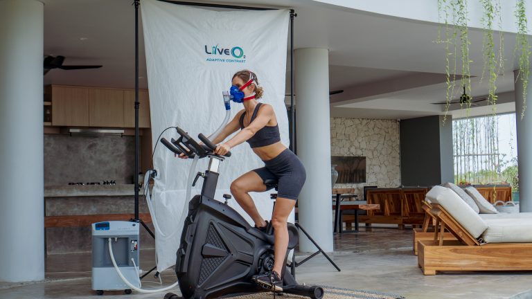 LiveO2 is Adaptive Contrast — you ride a stationary bike while breathing concentrated oxygen through a mask. The session alternates between high and low oxygen, which drives oxygen deep into your brain. At home or at a certified location.
