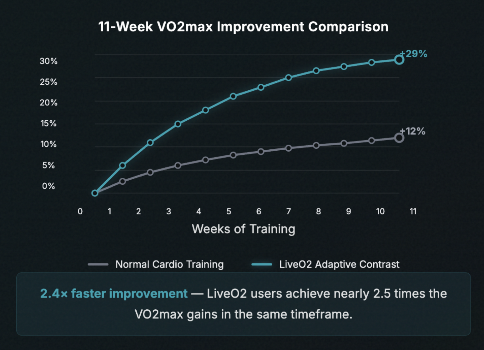 Results that normally take months of dedicated training — LiveO2 delivers in weeks.